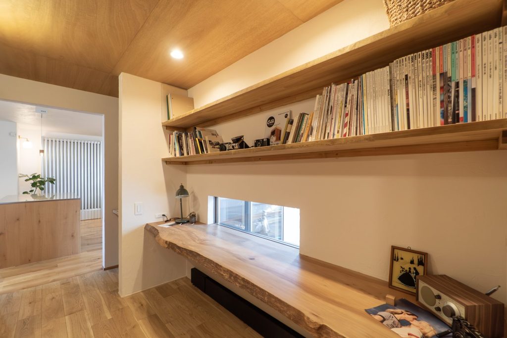 廊下にはワークスペースを設け、足元に暖房巾木パネルを入れることで、